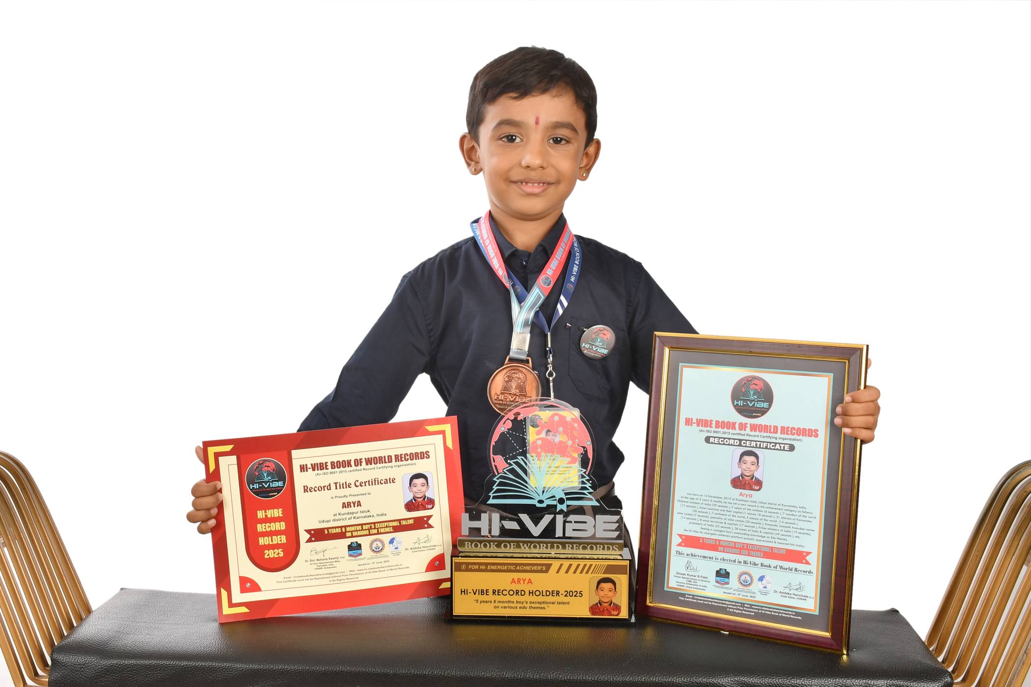 Arya was born on 14 November ,2019 at Kundapur taluk ,Udupi district of karnataka, India . At the age of 5 years 6 months ,he has set a new record in the achievement category by follows as follows ; National symbols of India (39 seconds ),7 colors of the rainbow (6 seconds ), 7 wonders of the world in (12 seconds ), Asian countries and their capital (1 minute 18 seconds ), 31 districts of karnataka (30 seconds ), 7 continents of the world , 5 oceans of the world (14 seconds ) , solar system (7 seconds ,speciality of solar system (20 seconds ),kannada jnanpith awardee names (14 seconds ), 8 union territories & capitals (17 seconds ), Prime ministers of India (19 seconds ), presidents of india (23 seconds ), 28 states of India & capitals (49 seconds ) ,etc, Seeing a youngest boy’s outstanding knowledge on Edu themes ,the Hi-Vibe for energetic achievers platform proudly appreciated & honored him today .