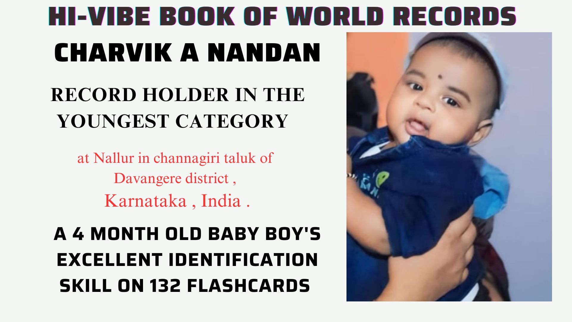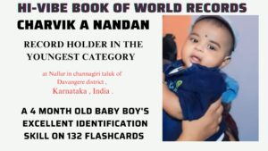 Charvik A Nandan was born on 22nd of December 2023 at Nallur in channagiri taluk of Davangere district of Karnataka , India . As a 4 month old baby boy, has set a new record by identifying 132 flash cards as follows ; Fruits 25,Vegetables, 31,Animals 28,Things 21,Colors 6 ,Emojis 2,Flag 2, Body parts 12 ,Flowers 5, etc. Seeing an infant baby’s amazing recognising skill on versatile flash card images , the Hi -Vibe energetic achiever’s platform proudly appreciated and honored him today .