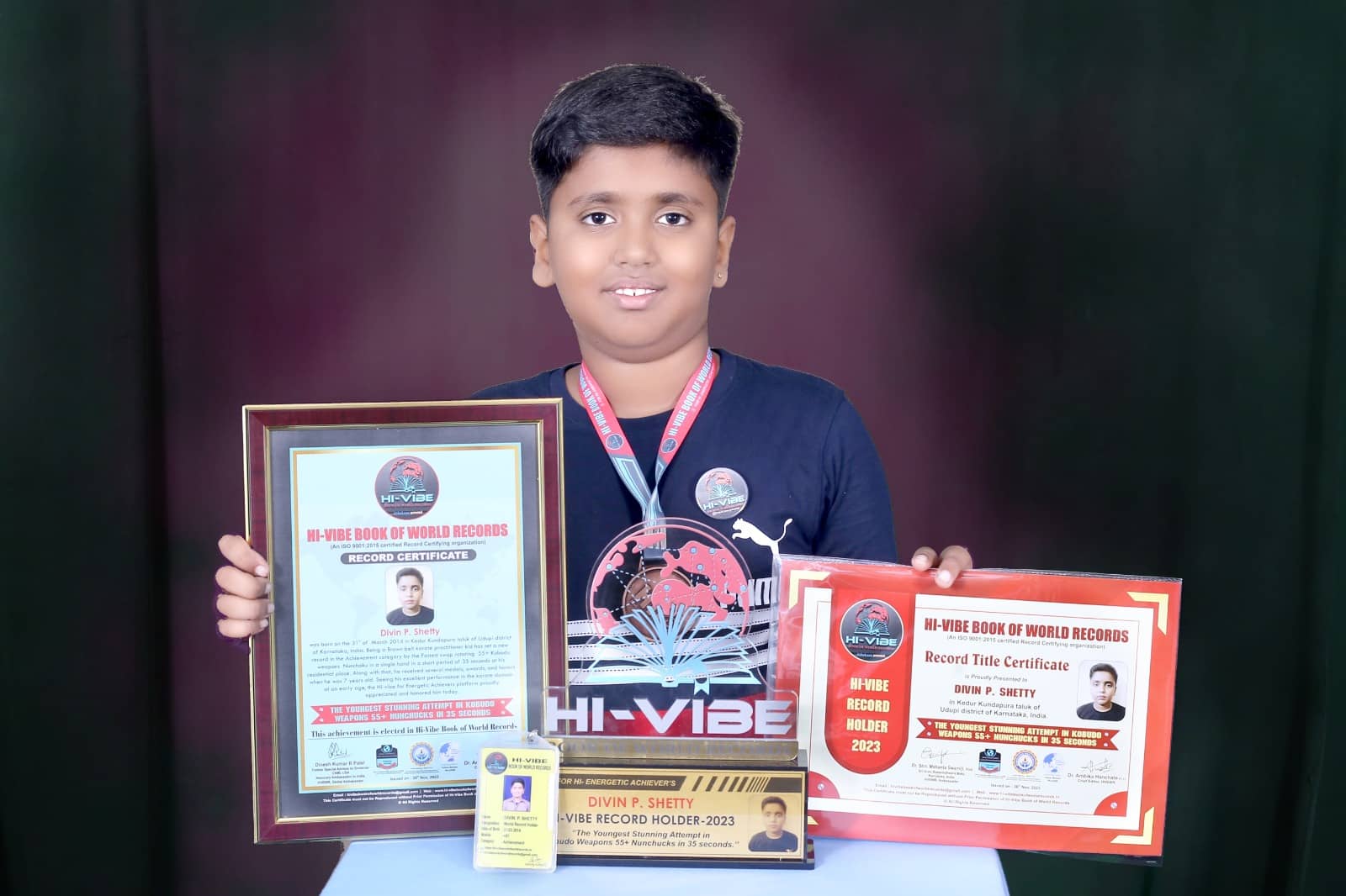 Divin. P. Shetty was born on the 31st of  March 2014 in Kedur Kundapura taluk of Udupi district of Karnataka, India. Being a Brown belt karate practitioner kid has set a new record in the Achievement category by the Fastest swap rotating  55+ Kubodu weapons  Nunchaku in a single hand in a short period of 35 seconds at his residential place. Along with that, he received several medals, awards, and honors when he was 7 years old. Seeing his excellent performance in the karate domain at an early age, the Hi-vibe for Energetic Achievers platform proudly appreciated and honored him today.