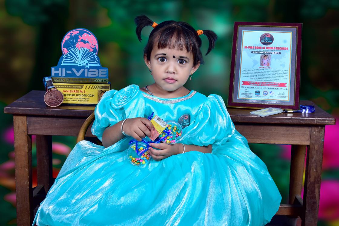 Janishree M S was born on the 14th of March 2021 in Kodagu, Karnataka, India. At the age of 2 years and 11 months she has set a new record in the intelligence category by self-doing a science experiment as follows; – Air occupied space, Lemon Volcano, Hand wash experiment, Mud painting, Germs theory, sink and float, sound energy, soluble and insoluble, Magnetic and nonmagnetic, lemon floating, etc. By seeing a genius kid’s fun science experiment and eagerness to learn science facts , the Hi-Vibe for Energetic Achiever’s platform proudly appreciated and honored her today.
