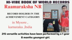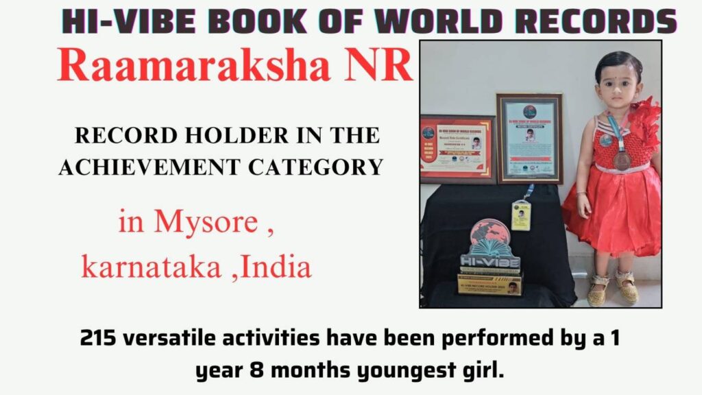 Raamaraksha NR was born on 11 September 2023 in Mysore , karnataka ,India . At the age of 1 year 8 months ,she has set a new record in the kids category by performing 200+ activities and those are as follows ; 100 +flash cards identification,God names ,Dashavataraa, mantra,slokas, Godvahana , vadhya, vegetables -25, fruits-30, animals -28 ,alphabets -26 ,Kannada swaragalu, electronic devices -10 national flag -10, Indian currency -7 ,monuments of India -8 ,scientist name-10 national symbols name, professionalist-10 , flowers- 12, learning accessories-25 mathematical symbols-6 geometrical instrument-10 grocery item- 38 ,Spieces-10, pulces -10, dry fruits and nut,insect- 15, musical instrument- 12 , medicine -10, jwellery -10, mekeup -10 and raw material of building ,kannada vowels with cards matching, Numbers in kannada & english ,alphabet letters matching ,indian currencies ,rainbow colors , panchabhoota galu, navagrahas, weeks ,months ,planets ,traffic signals , magic words,foods names ,versatile type of animals & it’s sound, opposite words in kannada & English , verbal actions and relevant themes ,parts of the body ,shapes, games ,jnanpith awardee names, planets ,gestures , good touch & bad touch and miscellaneous. By seeing 215 activities performed on various themes ,the Hi -Vibe for energetic achievers platform proudly appreciated and honored her today.