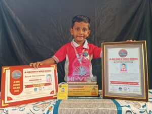Srivardhan M (was born on 3rd of August ,2020) who is studying at Nisarga Primary School ,Tanigere ,channagiri Taluk , Davangere District of karnataka ,India . He has set a new record in the kids category by identifying 50 flashcards about different objects like fruits , animals & vegetables in the shortest time of just 01 minute 04 seconds . Looking at his grasping power in identifying & quick learning, the Hi -Vibe for energetic achievers platform proudly appreciated and honoured them today.