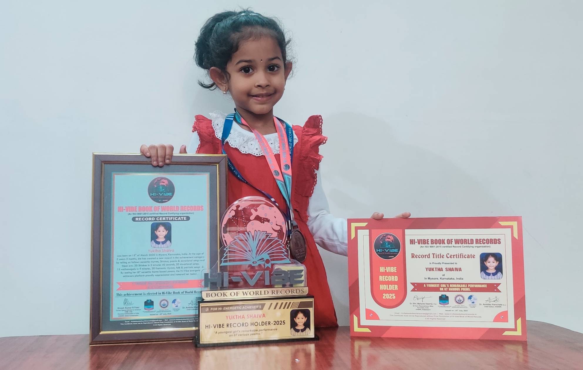 Yuktha Shaiva was born on 15th of March 2020 in Mysore ,Karnataka ,India . At the age of 5 years 3 months ,she has created a new record in the achievement category by telling as follows versatile rhymes, Shlokas ,poems & devotional songs and those are ; 20 Shlokas in 2 minutes 40 seconds , 20 devotional songs , folk and patriotic song ,15 vachanagalu in 9 minutes , 30 kannada rhymes , folk & patriotic songs -2 .By seeing her 87 versatile theme based poems ,the Hi-Vibe energetic achievers platform proudly appreciated and honored her today .